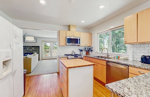 Enjoy breathtaking bay views from the newly renovated, furnished upper deck and lower-level patio at this 2,723-square-foot, daylight basement home with room for the whole family! Take a walk on the beach steps from the back door. Have fun crabbing or clamming and exploring the calm waters. This home is nestled within a quiet and peaceful setting that spans nearly a full acre of land and is surrounded by nature.
