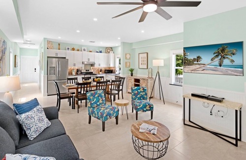 CASITA 1 - (aka the Duke of Catherine) was built to be the perfect vacation rental! The living area is open and spacious, feeling light and airy with a gentle tropical vibe. There is a large flat-screen Samsung Frame TV in the living room watchable from the large sofa, which pulls out to a queen sleeper for those extra guests, and the two chairs. The open floor plan seamlessly flows between the living area and the kitchen, creating even more open space and making the home feel even larger. The dining table seats 8 comfortably and the kitchen is fully equipped with every appliance and tool the chef in your group will need.