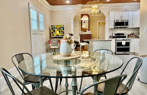 Welcome to the beauty of this newly renovated Historic home. High ceilings and crown molding throughout the house and two fireplaces compliment the Bohemian feeling with a mix of modern kitchen ambience. The Downtown Historic home offers 2 living rooms areas and additional sun room seating for your relaxation needs. Views of the historic Acworth railway while you sip coffee at the modern granite island. One Master bedroom with king bed and two additional guest bedrooms with a queen bed in each. We also offer an inflatable queen sized air mattress to sleep 2 additional guests and laundry area. 8-12 guests okay for gathering.