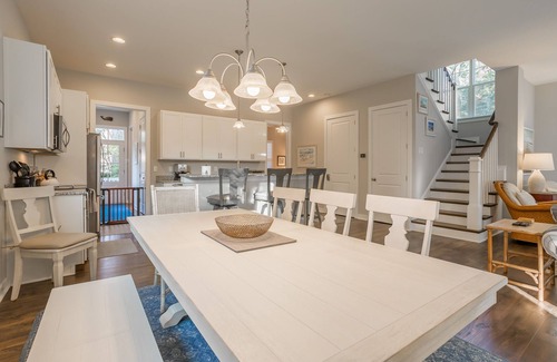 The fully equipped kitchen is ready to handle any of your home-cooking needs. Essential stainless steel appliances and ample quartz countertops allow you to prepare mouth-watering meals of various sizes. Savor breakfast around the kitchen island for 4, then gather everyone around the large 10-person dining table.