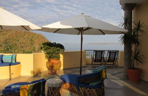 Dramatic open living style environment synchronizes starry nights, amazing sunsets, panoramic ocean and jungle views, sounds of the lapping waves into a memorable experience. Swimming Pool and Lounge Area common to all guests. This suite has a large outdoor/indoor well equipped kitchen, outdoor built-in gas bbq, and large dining table as well as many places to sit and lounge about while taking it all in. This is a one bedroom apartment with two twin beds/1 king bed, Egyptian cotton bed linens, separate bathroom with generous mosaic shower and luxurious thirsty Turkish towels.
