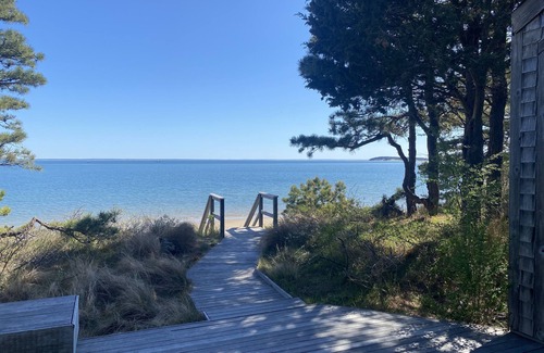 Wellfleet Chequessett Bluff dream beach house. Five bedroom, 3 1/2 bathroom family home right on Chequessett Bluff and Mayo Beach at the Harbor in Wellfleet, MA. Mayo Beach was selected as one of the top ten Family-Friendly Beaches in the USA. Full kitchen, living room, dining room, den, and large waterside deck. Outdoor hot/cold shower. Spectacular water views from living room, dining room, kitchen, deck and outdoor eating area. Peaceful garden and sitting areas. Private beach down the dune steps from the house. Walking/bicycling distance to Main Street and marina shops and restaurants. Walking distance to pier/marina, public tennis courts, and recreational field and skateboard park. Eight minute drive to four town Atlantic Ocean and Cape Cod Bay beaches and three fresh water ponds.