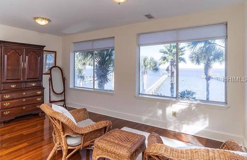 Beautiful 2 story waterfront home on St. Helena with million-dollar view. As you sit on the dock, you have a nine mile view across the marsh to the next habital land. You can sit on the floating dock and see sunrise and sunset from the same seat. The home itself has 4 bedrooms and 4 baths. The separate guest house sleeps 2 more with a private shower and kitchen area. The home and guest house sleep 13 comfortably. If you need room for a 14th, it will be a fouton. Our home includes outdoor kitchen, fire pit, pool (not currently heated), stunning sunsets in a quiet area. Bring your boat, kayaks and fishing gear to the deep water dock with minimum 10 ft of water at low tide. Crab traps provided.