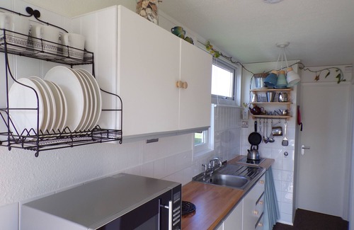 Lovely bright open plan living/dining area. TV with DVD player and Freeview. Fully equipped kitchen with microwave/combi oven, double electric hob, George Foreman grill, toaster, slow cooker and fridge with small freezer compartment.