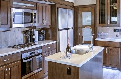 Driftwood is a 5th wheel RV featuring a spacious kitchen & living area, queen size beds in both the master bedroom & living area, nearly 330 sq. feet in all. The high ceilings add to a feeling of openness. Extra attention has been given to the outdoor area of this upgrade to make your visit even more enjoyable whether inside or outside.