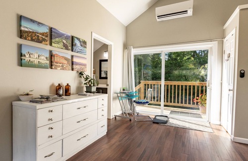 There is a beautiful bedroom with comfortable queen mattress great for a restful sleep after a long day of hiking. The room has lockable french doors with curtains and freshly cleaned egyptian cotton sheets and duvet covers for a great night sleep. And if you need more room, the lounger converts to a twin bed. You are in control of the heat/air to the temperature you like.