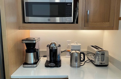 The main family room has plenty of comfortable seating, a large flat-screen TV over the wood-burning fireplace, high ceilings and a pair of French doors that lead out onto the spacious deck. Great for entertaining. The dining room seats 7 comfortably. The adjacent kitchen has stainless steel appliances, all basic utensils, pots & pans, spices, a toaster, a Keurig coffee maker, Nespresso machine and four counter-stools for additional seating.