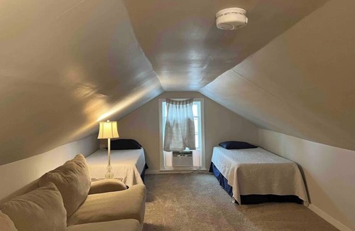 The second level features a bedroom with two single beds. Please note: This space features very steep steps and lower ceiling height. This space is not recommended for young children or elderly. The second level is a great space for sleeping, but due to the ceiling height that is all that is recommended. This space will generally be closed off, unless the extra beds are noted to be needed upon booking.