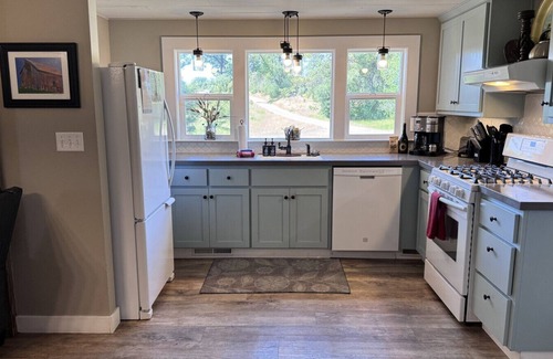In the cabin you’ll find all the amenities you will need in this highly upgraded 3 bedroom cozy home with 2 full baths When you walk in, you won't find the musty stuffiness, typical of many vacation rentals. The modern kitchen has all solid stone surface counters and is decorated to look and feel like an old style farmhouse. You will also find it fully stocked with pots, pans, bakeware and an array of spices.