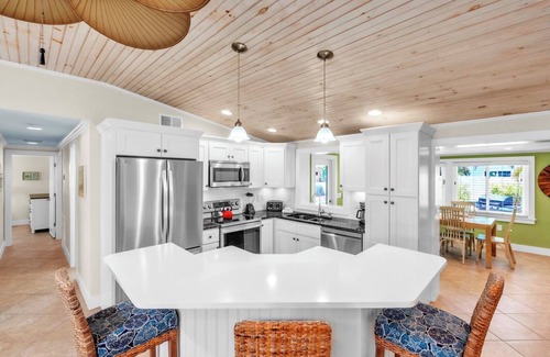 Come to this Island home and have a vacation of a lifetime! Totally remodeled, this 3-bedroom, 3-bath pool home is well appointed with designer finishes throughout. The living area has plenty of seating for the whole family. The kitchen is outfitted with gorgeous granite countertops and stainless-steel appliances. Start your day with your favorite morning treat at the breakfast bar. There is also a large Florida room with a dining table for six to gather around the family.