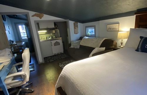 Newly remodeled space with queen bed, sofa bed, desk, chair, efficiency kitchen w/utensils, pots and pans, dishes, 2 burner stove, microwave, convection oven, toaster, fridge, & sink. Bathroom, too, is totally remodeled with new vanity, linen closet, walk-in shower, etc. Use of deck is permitted and has gas fire pit.