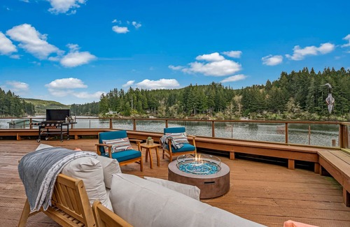 This rental is the perfect place for family and friends to make memories on Tenmile Lakes on the Oregon Coast. It sits on the waterfront of Coleman Arm on South Tenmile Lake. The home is beautiful inside and out with granite counter tops, comfortable beds, black out blinds, huge deck, blackstone outdoor grill, hot tub, cozy outdoor furniture and a gas outdoor fire ring. Enjoy the amazing views of the lake and forested mountains from inside or out. The style of the cabin is fun and modern and decorated with local art and custom art. This rental comes with access to the secure boat house to park your water toys! Use the dock to fish, swim, or sit and enjoy the lake and wildlife. This home is surrounded by beautiful woods and during winter storms or high wind events, there can be power outages, but there is a generator that will keep you cozy. We do not offer refunds for events out of our control.