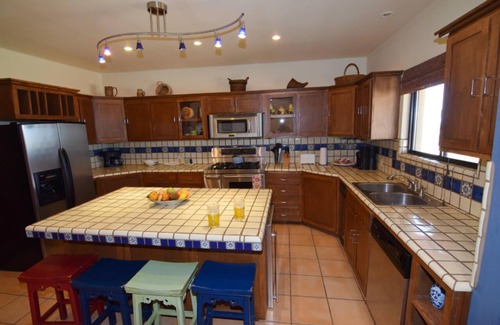 The private courtyard entrance with fountain offers and impressive view and the relaxing sound of running water. There is a spacious outdoor veranda and BBQ. The most impressive is the gourmet kitchen showcased by the most modern of appliances and the professional cook top and ovens. This kitchen is totally equipped for you to prepare gourmet meals including cappuccino. Yes there is a cappuccino machine. Imagine, patio dining, watching the moon rise over the Sea of Cortez, sipping cappuccino.