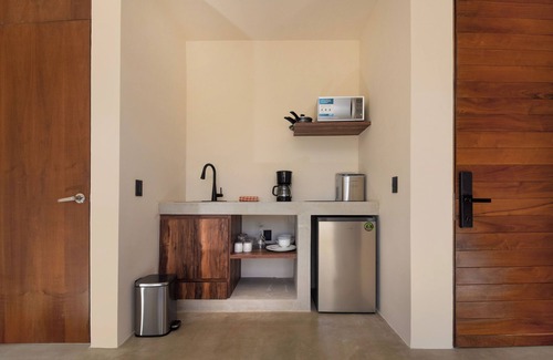 La Guacamaya is a beautifully curated second-story penthouse in Tulum's Tuane complex, blending modern design with comfort. This two-bedroom unit is ideal for up to 5 guests, featuring queen beds and a twin pull-out sofa. With a main kitchen and an additional kitchenette in the lock-off bedroom, the layout is perfect for groups seeking a balance of togetherness and privacy. With a 50" TV in the living room and starlink wifi, you'll be able to stay connected while enjoying a peaceful stay. The unit has a private terrace with outdoor seating as well. Make El Guacamaya your Tulum retreat for an unforgettable stay. Please note this unit is on the second story, and there is no elevator, so you will need to climb a flight of stairs to access.