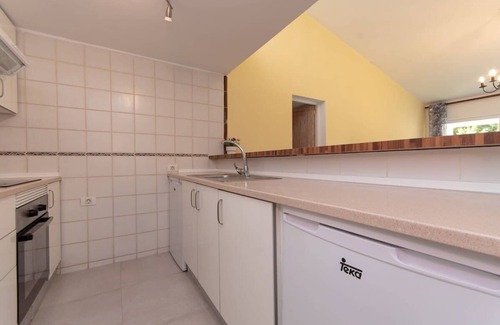The apartment boasts a balcony with captivating views of the mountains and sea, furnished with a wooden patio table and chairs. There is also a clothes airer available for drying laundry. The patio doors lead into a cosy lounge area, featuring an L-shaped sofa and a flat-screen TV with a wide selection of English and international channels. Additionally, a TV box is available, providing an extensive range of channels. The apartment is equipped with fast WIFI fibre optic internet access as well. The kitchen is fully equipped with modern amenities including an oven, ceramic hob, extractor fan, microwave, kettle, toaster, fridge, separate freezer, breakfast bar and a washing machine. There is also a security safe for guests extra peace of mind.