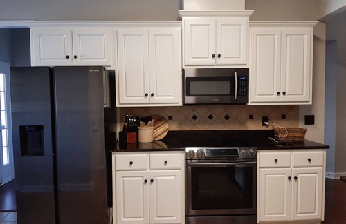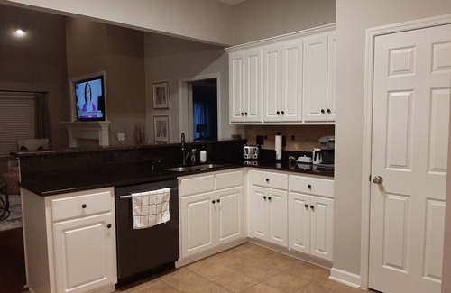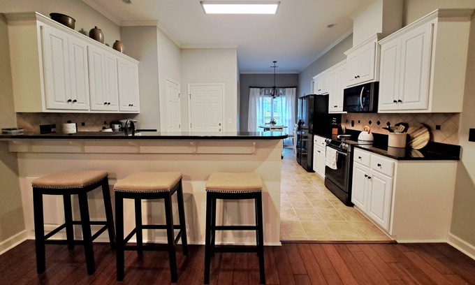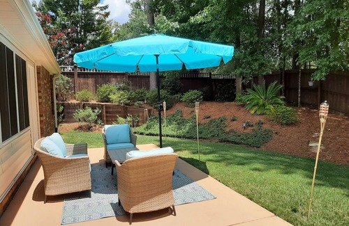 This stylish place to stay is perfect for group trips. Newly furnished three-bedroom two-bath home in a quiet residential neighborhood. Home features two car garage, 10 ft ceilings with 18 ft vaulted ceilings in living room. Gas fireplace. Spacious main bedroom with private bath. Two comfortable guest rooms separated by their own guest bath. Conveniently located near shopping and dining and a short drive to beautiful downtown Aiken. Lovely backyard with well manicured flowering bushes. Access to community pool.