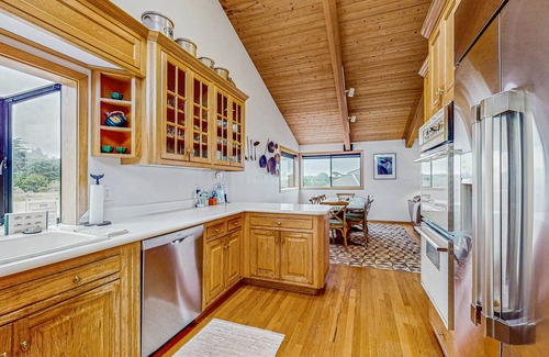 With a spacious interior and truly spectacular natural surroundings, this two-level home is ideal for families or groups of friends in search of rest and relaxation. The refined living space is on the second floor, allowing guests to enjoy commanding views of the ocean, the nearby cliffs, and the local wildlife. Take an afternoon nap on the soft leather sofa, play a card game in a seat by the window, or spend a quiet evening watching a DVD favorite on the flatscreen cable TV. WiFi is also available at this home. You'll find plentiful cabinet and counter space in the full kitchen, which also features double ovens and a dishwasher to make cooking a breeze. Sit down for dinner with your family in the dining room, or step outside to find a gas grill and a patio table on the ocean-facing deck. Back on the ground floor, you'll enjoy daily soaks in the luxurious outdoor hot tub, while the gated garden and lawn provide outdoor space for as many as two dogs. Please be advised, however, that an additional nightly fee applies.