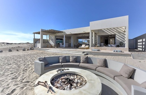 Enter into this palatial vacation home’s open layout, featuring phenomenal indoor-outdoor spaces that literally bring the beauty of Baja California right into your living space. The interior is impeccably and professionally designed and furnished. Outside, you’ll find not one but two fire pits, beach front hot tub, and roof top deck. An interior patio provides a sublime, private space for pool bathing and lounging.