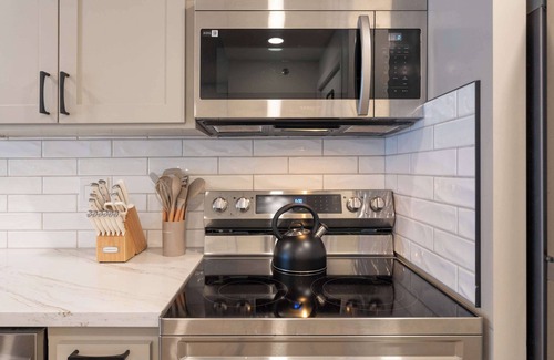 The bright and airy main living area creates the perfect space for relaxing. Switch on the gas fireplace and stream a movie on the large 60” Samsung Smart TV, powered by Starlink Satellite, as you whip up dinner in the fully equipped kitchen. The kitchen features stainless steel appliances, glossy quartz countertops, ample cabinetry with fully stocked cookware, dining ware and glassware. Four counter stools are seated at the extended countertop creating the perfect spot for mealtime or a game of cards. The modern bathroom features a glass walk-in shower with niche, sleek vanity, front lit LED mirror and Moen hardware.