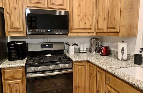 The modern full-size kitchen is fully stocked with all pots, pans and dishware includes coffee maker air fryer, and much more. Everything is brand new and super clean! The large dishwasher makes clean-up a breeze and the washer/dryer make longer stays more convenient. Central A/C and Heat keeps away the summer heat and chill of winter. Although, with four mild seasons often barely used