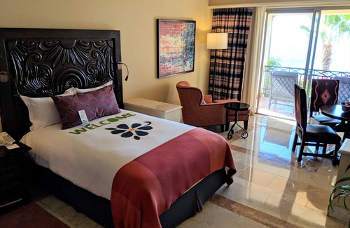 ROOM ACCOMMODATIONS include: Premium feather top beds, marble bathroom with deluxe amenities, 24 hour in flat screen HDTV with popular cable channels, central A/C, fully equipped kitchenette (with refrigerator, microwave, and cook top stove, coffee maker, pots & pans, eating utensils, plates, bowls, glasses and cups) and plush living area with over-sized chairs & table facing the panoramic ocean view. Each suite has their own private patio/balcony area & comfy patio chairs to enjoy the stunning view & setting. The price includes free daily maid service. Our guests are provided full access and room charging privileges at all four local Pueblo Bonito resorts (Rose, Pacifica, Los Cabos/Blanco and Sunset Beach and the Montecristo Club House - Pool, Gym & Spa). Free shuttle service is provided for guests to all nearby Pueblo Bonito properties. Free golf cart shuttles work 24/7 to transport guests throughout the Sunset Beach property.