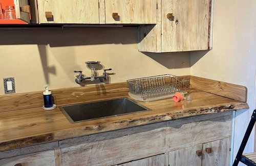 From the porch, step into the quaint kitchen which leads into a spacious living area with east-and west facing windows. The living room has a large leather couch and an armchairs, a dining room table that can extend to seat 6, a smart TV and high-end stereo to stream music from the TV apps or your phone.. The stone fireplace has been refurbished with a glass-door fireplace insert for cozy winter evening fires. The other side of the living area features a desk and is set up as a workspace, There is a leather pullout sleeper couch if you need extra sleep arrangements.