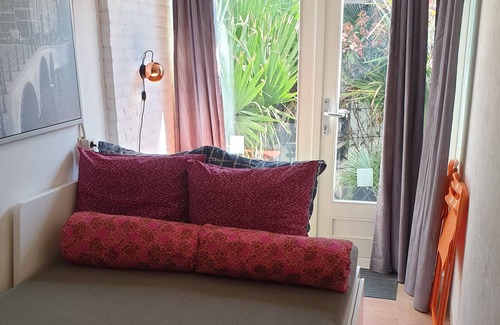 The entrance is very small and narrow and low and I have many many plants in my front yard along the walking path to the studio. This means that the entrance and the walking path are not comfortable, also for the check in and check out especially if you have many and big bags. The leaves of the plants are closing the walking paths so you may need to bend and to take away the leaves closing your sights everytime you go out and in. I love the plants, so I expect my guests to not ruin them.