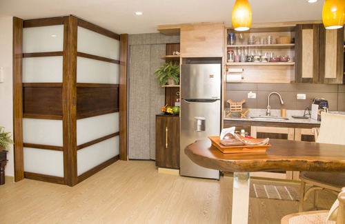 The entire apartment was designed for Medellin's year-round pleasant temperate climate as all sliding doors can be opened up so that the ample balcony and large terrace become one with the indoor space with nice breezes throughout the day. If a pop-up thunderstorm occurs the terrace has high 14-foot roof that is motorized and remote-controlled. roof that will extend out to cover the terrace with either an opaque, waterproof cover or completely covered with a bamboo roof. The terrace features a waterfall fountain, lush vines and plants that are on an automated drip system. Comfortable seating and a table allows for al fresco dining. Large Smart TV which can be pivoted for great viewing anywhere on the terrace or from the kitchen.
