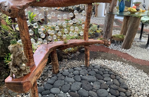 While our cabin is rustic, we have ensured that all modern creature comforts are provided. Unplug and enjoy the ultimate luxury of life - beautiful nature, with your loved one by your side. Our one-of-a-kind outdoor rain shower is created with a hundreds-year-old Ohia log and large, smooth lava pebble stones, surrounded by all kinds of succulents and tropical plants.