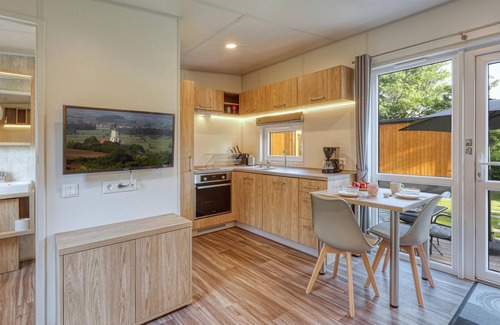 The idyllic camping park is located close to nature, directly at the Waldsee, a bathing lake with lido, beach bar, sunbathing lawn, giant water slide and children's pool as well as playground, beach volleyball court and small soccer field. To explore the area from the water, canoes can be rented on site. A highlight is the mini golf course on the grounds of the camping park (for a fee). Furthermore, there is a kiosk, a sauna as well as a laundry room (for a fee) and a Wi-Fi hotspot. This Tiny House offers you its own Wi-Fi access.