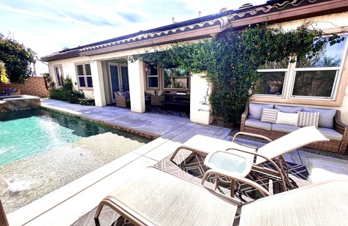Embrace the great outdoors with the fire pit and beach towels, or take advantage of the on-site fitness room and equipment. Whether you're seeking a relaxing retreat or an adventure-filled getaway, this villa in Indio has it all.