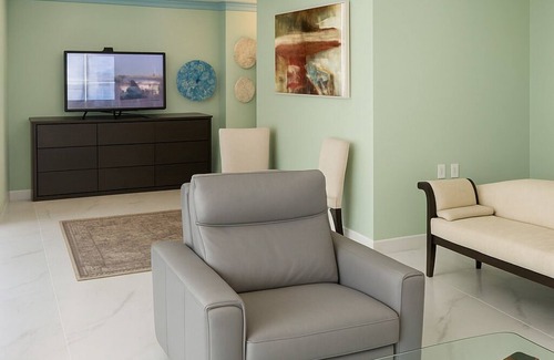 Living area with sofa, wall-mounted TV, Wi-Fi, A/C, intercom, and marble floors
