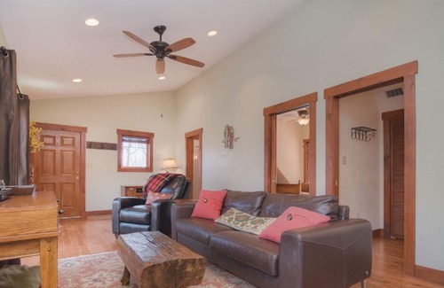 The main house at Harmony Hill features a spacious living area that draws folks to relax around the gas fireplace and 60-inch TV. Entertainment options include satellite channels, a Sonos sound bar, a DVD player, and Apple TV with access to popular streaming services. Enjoy the ease of family cooking in the tidy kitchen, equipped with a double oven and a Keurig coffee brewer. Retire to the well-appointed owner-on-main suite, featuring a king-size bed, walk-out deck access, and a huge shower and jetted tub in the attached full bath.