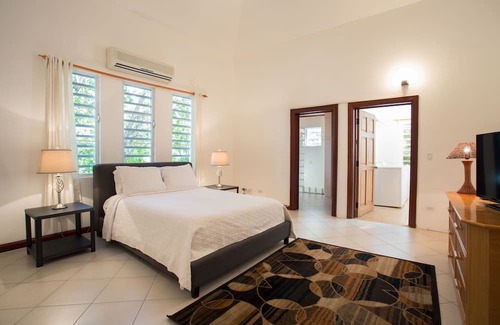 The villa's bedrooms feature a king-sized bed, air-conditioning, and a ceiling fan for your utmost comfort, complemented by an en-suite bathroom with a shower. The main bedroom has large sliding glass doors that lead you to a patio, offering an inviting sitting area with unobstructed views of the beautiful beachfront.