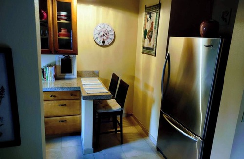 The Modern Sunlit Kitchen boasts gorgeous maple cabinetry with soft-close drawers, glass front cabinets, a dual sink, breakfast bar with stools and neutral tiled flooring. It is fully equipped with a Large Stainless Refrigerator/Freezer, Built-in Convection Microwave, Glass Cook-Top, Toaster, Slow Cooker and more. It is complete with all the amenities for Food Prep (Pots & Pans, Electric Tea Kettle, Cuisinart Drip Coffee Maker, French Press, Dinnerware, Glassware, Mugs, Dishware and Utensils, Snacks).