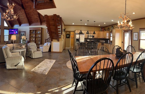 This large lakeview property is breathtaking! The house sits atop a hill with spectacular views of Kentucky Lake and a large front and back yard. The open floor plan is perfect for large families. The living room has a large stone fireplace, elk chandelier and a one of a kind staircase reminiscent of home fit for Yellowstone! The fully stocked kitchen is perfect for entertaining large families or a romantic weekend getaway. The home has a large front porch and two additional private porches off of the downstairs bedrooms perfect for morning coffee or an evening cocktail. Or you can cozy up on the large back porch with seating for 6 to grill out or just relax. There is a two car garage so bring your boat (you can put in about a mile away). The property is located about 5 minutes away from Buchanan Resort where boat and watercraft rentals are available.