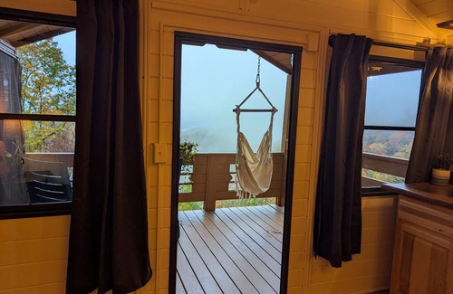 This cozy one bedroom has everything you need. A plush Queen sized bed, a private seating area and dining table. You have a private bathroom in your cabin with a shower, plush cotton towels are provided, the bathroom has a low ceiling. Off the back of your cabin is a private porch with seating and hammock swing for you to take in the expansive long-range Mountain views. You will have a hard time tearing yourself away from this view!