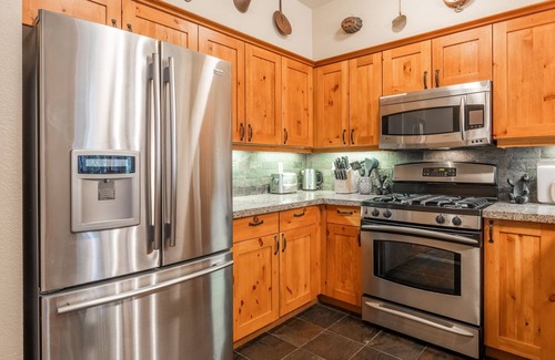 A classic log cabin façade hints at the coziness and charm inside this ground-floor, end-unit condo. In the comfortable living area, plush furnishings and a gas-burning fireplace create the ultimate space for watching the 55” TV. The chef of the group will appreciate the high-end appliances. For outdoor lovers, the shady patio has a 2-person cafe set, a Weber 2-burner gas grill, and views of the wooded grounds. Feel free to pack light thanks to the stacked washer and dryer hidden in the hallway closet.