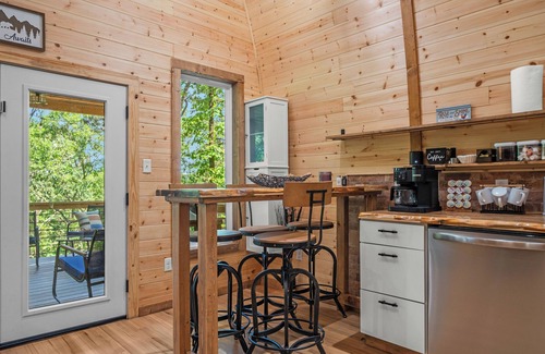 Family-friendly cabin with stunning wooded views! Enjoy a private hot tub, full kitchen, and handcrafted details throughout—from vanities to light fixtures. Sleeps 8 with a king bed, queen bed, queen sleeper sofa, and two twin beds in the loft. Each bedroom features a smart TV, and the loft includes personal TVs with headphones for kids to enjoy their own shows. Cozy up by the electric fireplace or relax in the open-concept living area. With two full baths (one on each level), everyone has space to unwind. Step out onto the deck to soak under the stars or gather around the fire pit for s’mores and stories. A peaceful escape with thoughtful touches and custom charm—perfect for couples, families, or a group of friends looking to reconnect with nature in comfort.
