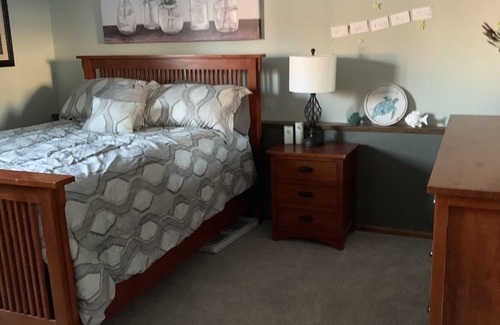 Comfy 2100 sq ft family home, large fenced backyard walking distance to Lake Elmo, close to golf course, sliding glass door to patio, occasional deer, squirrels and rabbits. New gas fireplace, master bath and main bath. Wi-fi and Spectrum TV. Family room and separate living room. Well equipped kitchen, washer/dryer, relax, put your feet up and kick back in comfy recliners. Discount for weekly rentals.