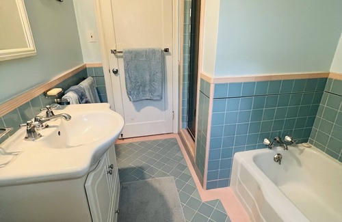 Our split level home has three bedrooms and two baths. The first bedroom has a California king bed with French doors opening onto a deck. The second upstairs bedroom has an extra long double bed offering a comfortable nights sleep for a tall teenager or an adult. The upstairs bathroom has a bathtub and separate shower. Downstairs is a finished basement with a queen bed. This room also has a private bathroom with a clawfoot tub and shower. A door leads to a patio and the backyard.
