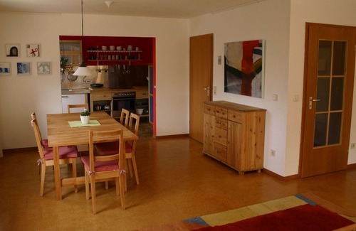 The house is surrounded by a large garden (0.8 ha) with orchard, vegetable farming (dynamic biology) for self-catering, flowers, herbs and a spring. We have a fish pond, sheep, chickens and play area and barbecue area. Everyone can find his own place here that invites for activity and play as well as for recreation and relaxation. Sandpit, slide, 'knights castle', table football, table tennis, soccer field on the premises.