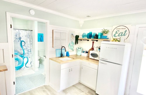 Off the kitchen is a full bathroom, stylish and clean featuring a stone top vanity, double shower and fun beachy decor.