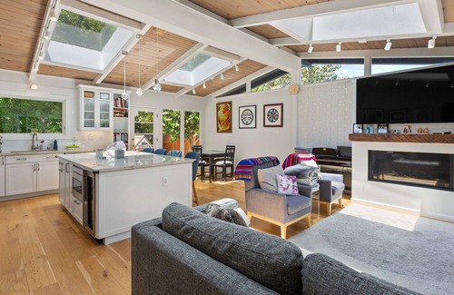 Charming Mid Century home lovingly updated and decorated. The house is inviting and filled with happiness and warmth. Very quite and tranquil neighborhood set within the hills and trees. Yet only 5 min from shopping, restaurants. Showered with sunlight due to the skylights, the home is very bright and airy. Enjoy the mountain views from the large rooftop deck while drinking a cup of coffee. This home feels very private and is very suitable for families with kids looking to explore Mill Valley!