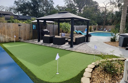 Welcome to your ultimate Jacksonville Beach getaway, where fun, relaxation, and comfort meet. Step into your private backyard oasis, complete with sparkling pool, soothing hot tub, and shaded cabana seating - the perfect spot for lazy afternoons or nighttime chats by the fire pit. For those who love to say active, enjoy your very own pickleball court and putting green, bringing resort-style fun right to your backyard. Whether it's sunny pool days, evening soaks under the stars, or simply swinging in the hammock, this home is built for making memories.