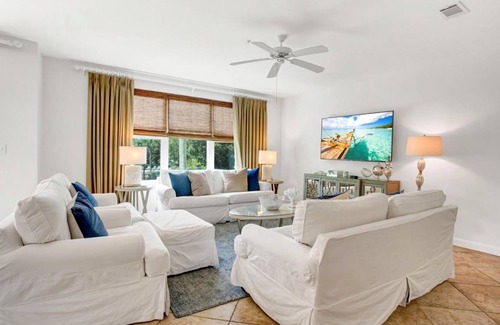 The large and spacious living area is relaxing and comfortable with 2 linen slipcovered sofas and 2 chairs ensuring plenty of seating for everyone as well as 70" Smart TV with cable channels, Netflix, Hulu & Disney+. Off the living room is an additional powder room.