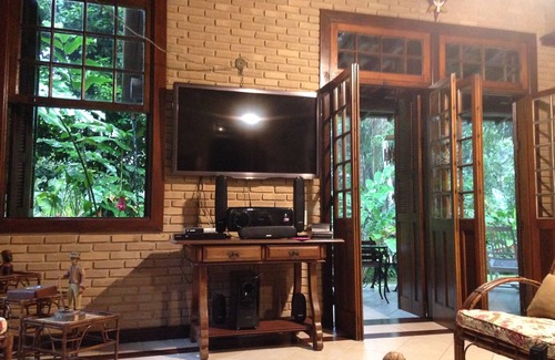 The house is fully isolated with built area of 300sqm and 1500sqm of land. Large living room with 3 environments, kitchen, two balconies, pool with deck, barbecue and hammocks. Covered garage and outdoor parking for 4 cars. House built with demolition material, all decorated. Surrounded by vegetation (Atlantic forest). It is located 300 meters from the beach. The house has two suites and two bedrooms that sleep well 10 adults and 2 children. Total of 3 internal bathrooms. Internet (wifi) - subject to network swings.