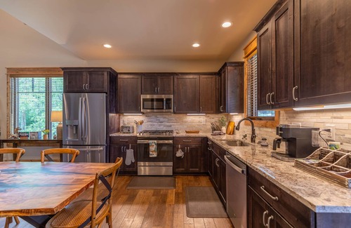 The fully equipped kitchen provides cooking essentials and stainless-steel appliances including a dishwasher and double door fridge & freezer with ice maker, plus the eat-in dining area at the live-edge table provides plenty of seating for your friends or family. Relax on the circular sectional in the great room to watch your favorite show on the cable TV, or grab a mug of tea and read a book by the fireplace. A half bath and laundry are provided on the main floor for ease of access.