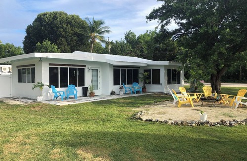 Take your vacation in a home featured on HGTV. As seen on 'Vacation Home for Free'. Renovated concrete 3 bedroom home, directly in front of the boat basin on the bay side. Unique street with a real sand beach for swimming, kayaking, paddle boarding or sunning. Wake up in the mornings and drink your coffee in our huge front yard looking at the bay and listening to the water. At night, enjoy a drink by the fire, then get into our outdoor shower under the stars. Our home was completely redone by HGTV. Master bedroom has one king bed, guest bedroom has 1 queen bed, and the 3rd bedroom has twin beds. One full bath and one half bath with a great outdoor shower. One trip to the nearby grocery store and you can cook in the granite topped kitchen, or hop over to the many restaurants in the Key Largo area. Walk or bike the neighborhood for exercise. Be our guests and stay in the home which was just transformed into an amazing Beach Bungalow by HGTV.