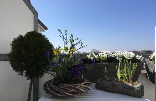 The apartment with balcony is on the 3rd Floor and is easily accessible by elevator. The entire living area and the bedroom is allergy-friendly with a design covering in wood look and exudes a cozy atmosphere. The living room with cable TV, CD radio and dining area with integrated kitchen is furnished with great attention to detail. A comfortable sofa bed that can be pulled out offers another 2 sleeping options for our guests. The fitted kitchen has a 4 - plate ceramic hob and oven, fridge with freezer, coffee machine, microwave, kettle, toaster and mixer.